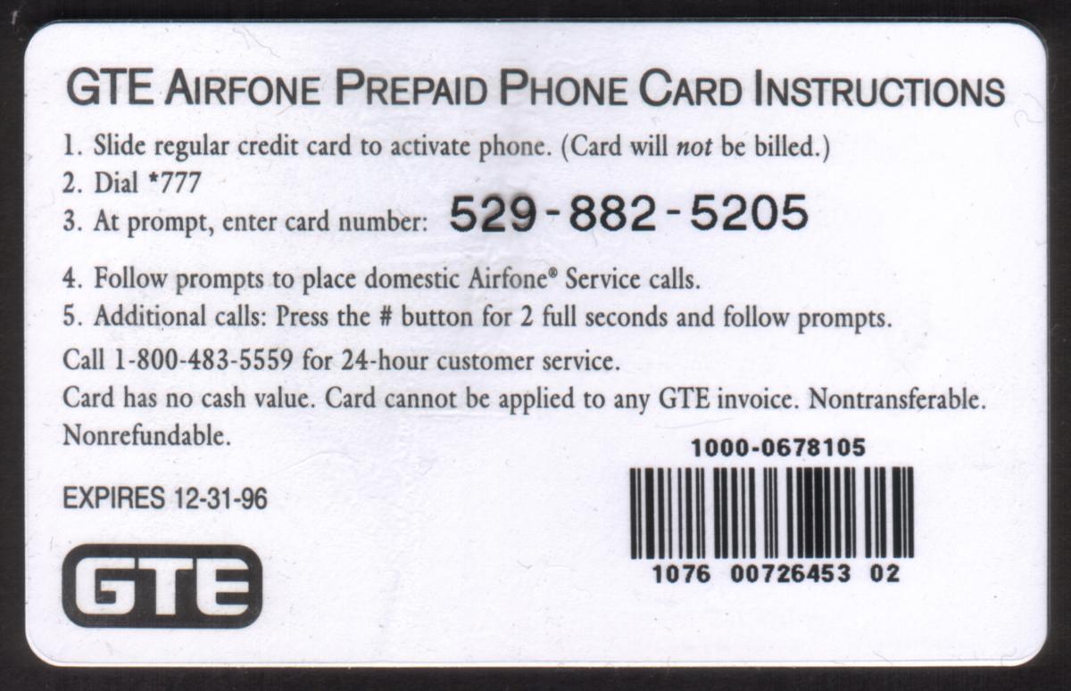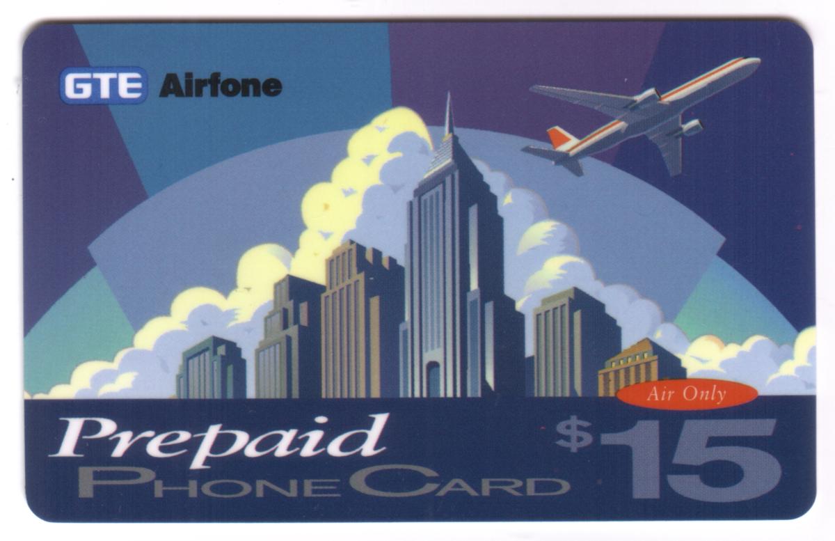 This $15 GTE Airfone prepaid phone card combines a graphic cityscape and airplane design, presenting a clear and visually appealing representation of air travel communications during the mid-1990s.