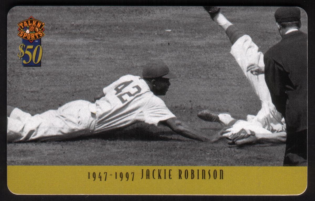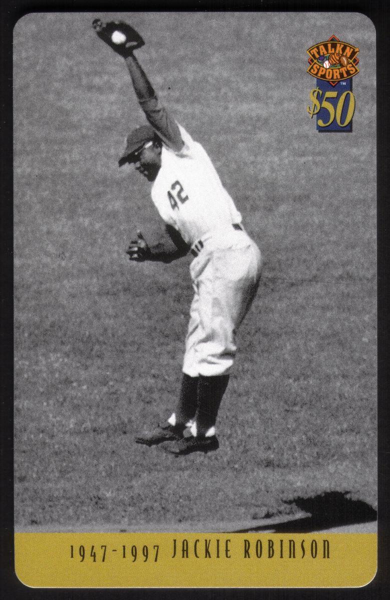 This set of five collectible phone cards honors Jackie Robinson, commemorating the years 1947-1997. Each card features a distinct black-and-white image highlighting significant moments and aspects of Robinson’s baseball career. The cards are marked with a "$50" denomination and the "Talk N' Sports" logo in the upper left corner. Below the images, a gold banner displays the text "1947-1997 JACKIE ROBINSON."