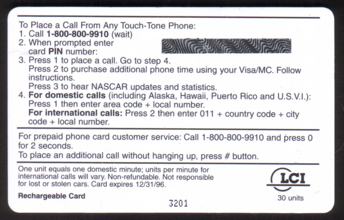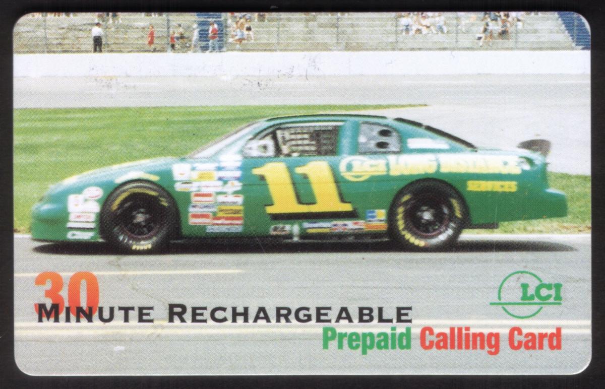 This card relates to auto racing and automotive sports, emphasizing a specific NASCAR car branded with the LCI International logo. The calling card is intended for prepaid use with a 30-minute rechargeable duration.