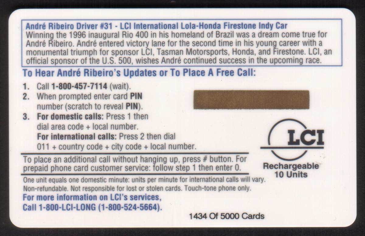 This collectible card features a detailed image of Andre Ribeiro driving the #31 Indy Racing car during the inaugural U.S. 500 held at Michigan International Speedway in May 1996. The vehicle prominently displays the LCI International logo across its black and yellow body, with additional sponsorship decals including Bosch and CNN visible near the front wing and cockpit area. The helmet worn by the driver shows a colorful design but bears no number.