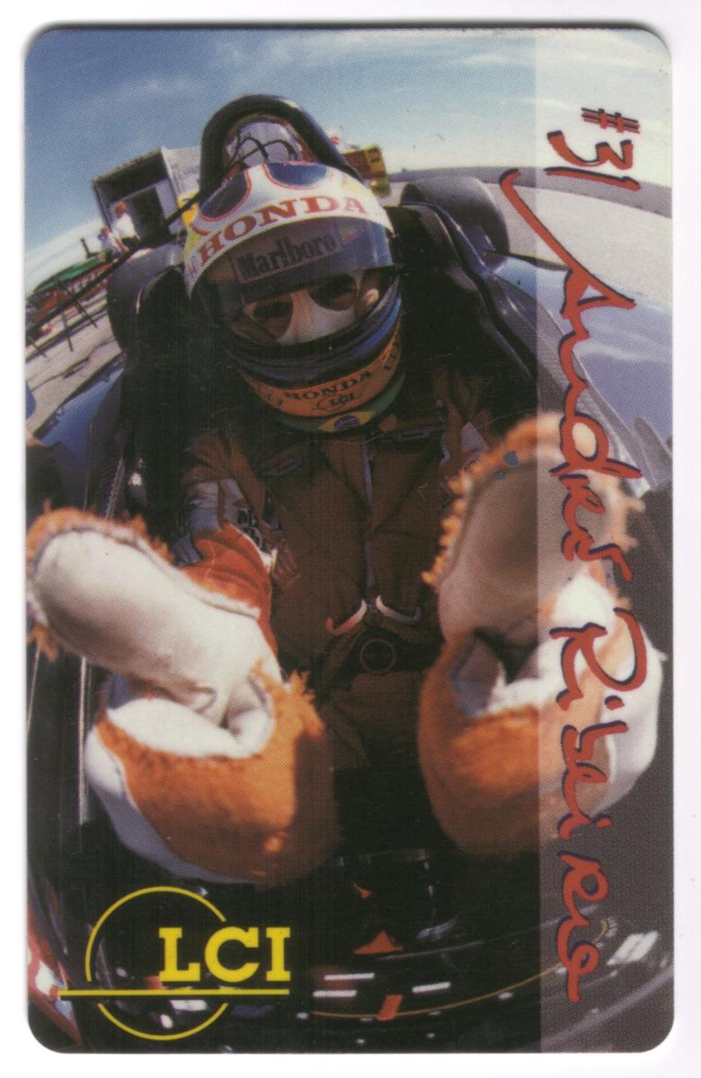 This collectible phone card features a close-up photographic image of Andre Ribeiro, an Indy Racing car driver, seated in his race car. He is wearing a racing helmet with visible "Honda" and "Marlboro" branding, along with a racing suit and gloves gripping the steering wheel. The perspective emphasizes the driver's hands and helmet, giving an immersive view from the cockpit of the car.