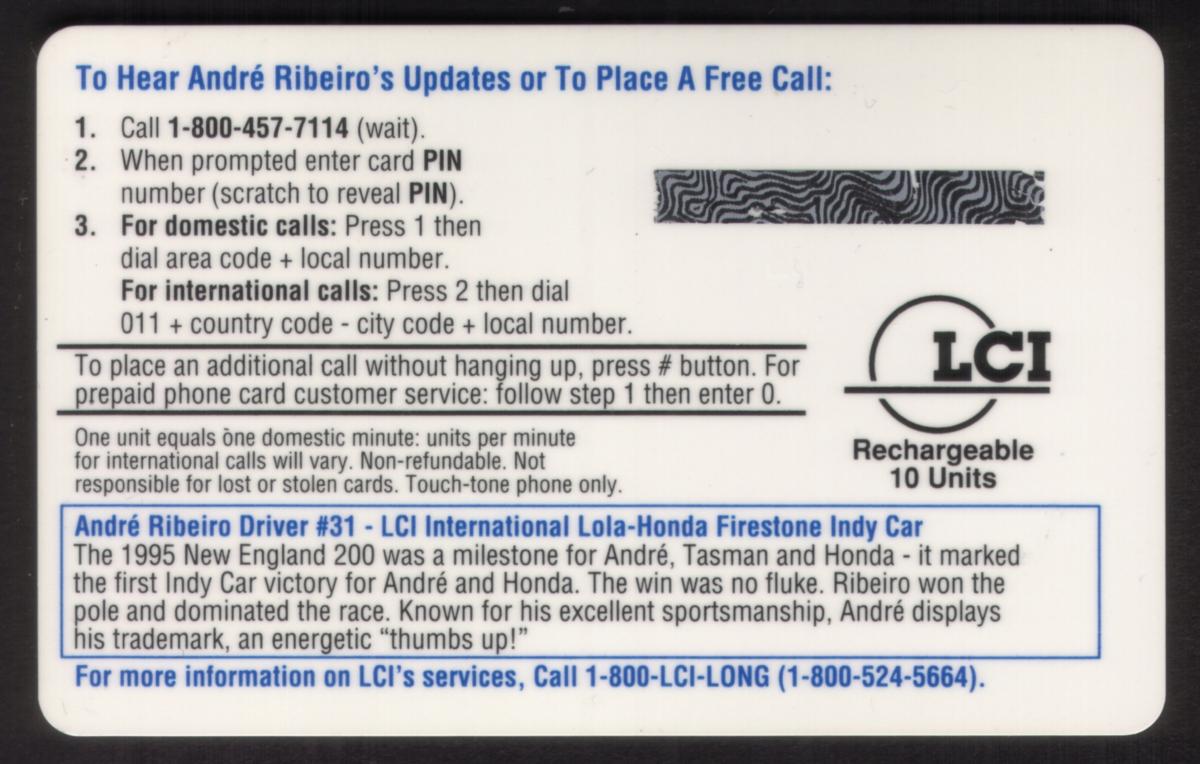 Prominently displayed on the right side of the card is the red autograph-style text reading "#31 Andre Ribeiro." At the lower left corner is the yellow and black "LCI" logo. The overall design captures the intensity and focus of auto racing, specifically referencing Andre Ribeiro’s victory at the 1995 New England 200.
