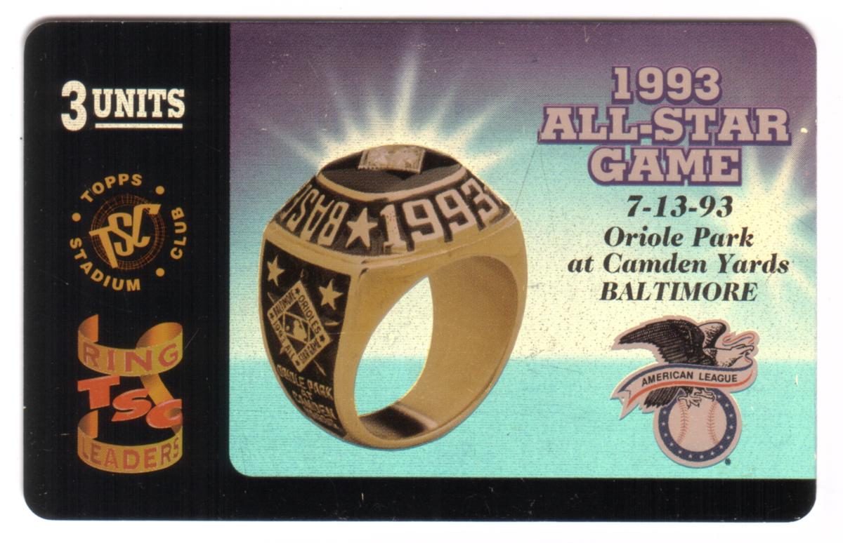 This card is part of the Topps Stadium Club 1993 All-Star Game collection, celebrating Major League Baseball players and the historic All-Star event at Baltimore’s Camden Yards. The use of gold tones in the ring contrasts with the teal and black background, creating a striking design representative of the American League's presence at the 1993 MLB All-Star Game.