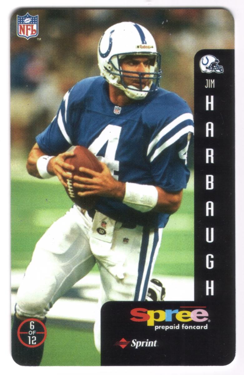 At the bottom right of the card, the colorful "Spree" logo identifies this as a prepaid foncard issued by Sprint. The red circular emblem at the bottom left indicates this card is number 6 in a limited series of 12. This card belongs to a series dedicated to quarterbacks in the NFL, highlighting Jim Harbaugh’s athletic career with the Colts.