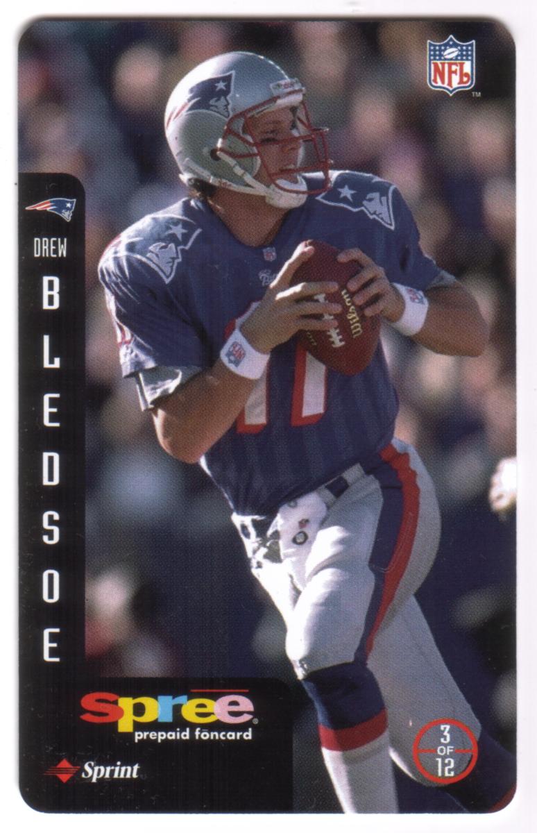The lower portion of the card includes the colorful "spree" logo indicating it is a prepaid foncard issued by Sprint. The bottom right corner displays the numbers "3" and "12" inside a small circle, consistent with the collectible's identifying details. The design and imagery emphasize the football theme and the association with the Patriots and Drew Bledsoe as an athlete.