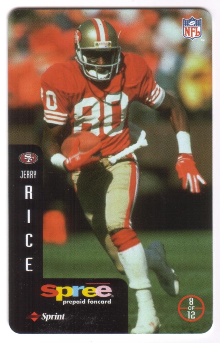 The card includes official NFL branding in the top right corner, ensuring its authenticity and connection to professional football. The name "Jerry Rice" is vertically printed in white text on a black vertical bar along the left side of the card. Below the name is the colorful "Spree prepaid foncard" logo, indicating this card’s use as a prepaid phone card. Additionally, the Sprint logo is displayed at the bottom left corner, linking the card to the telecommunications company.