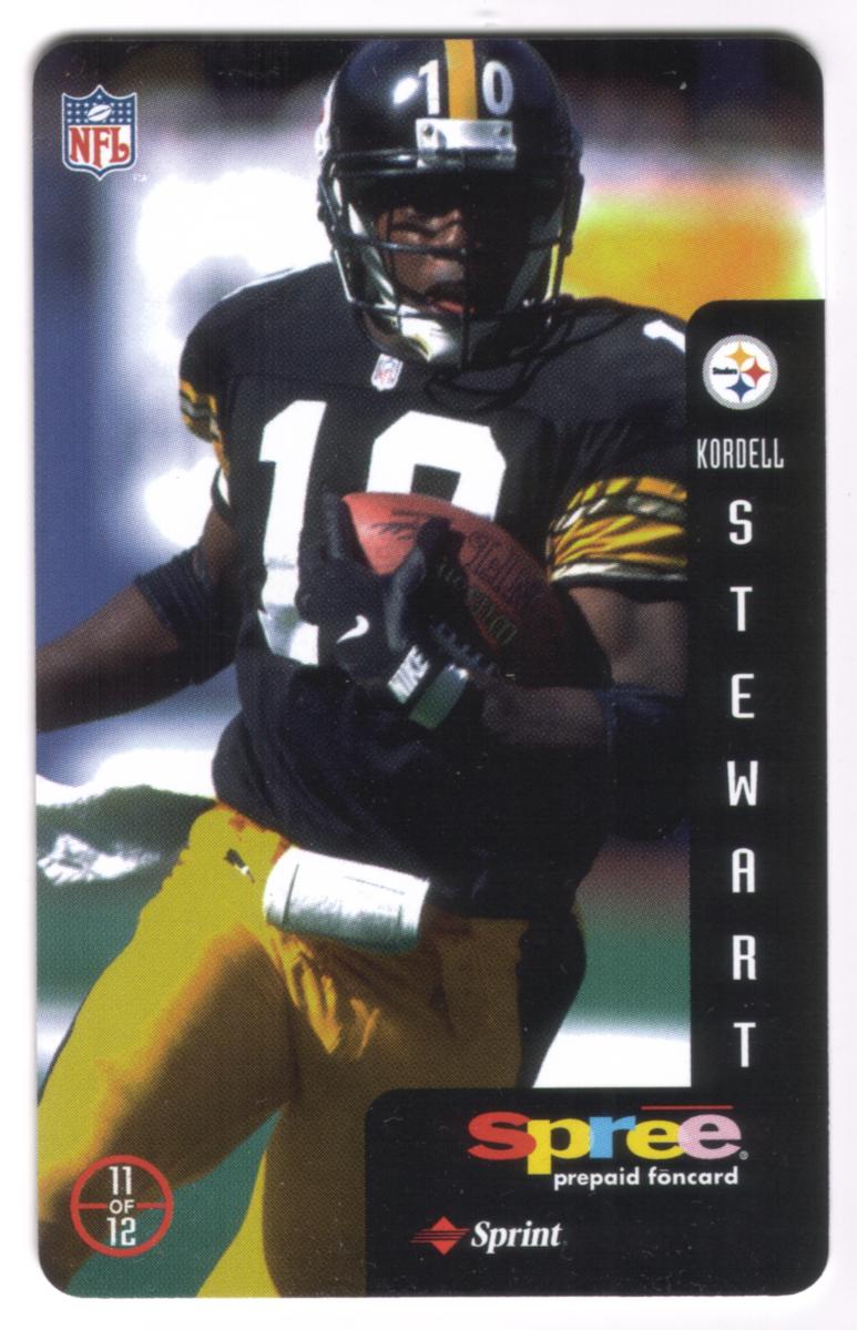 In the upper left corner of the card is the official NFL shield logo. On the right side is a vertical black strip with the name "Kordell Stewart" written in white letters, along with the Pittsburgh Steelers logo. The bottom of this strip has the player's first name in smaller text above the last name. The lower portion of the card features colorful branding for "Spree" prepaid foncard and a Sprint logo underneath it.