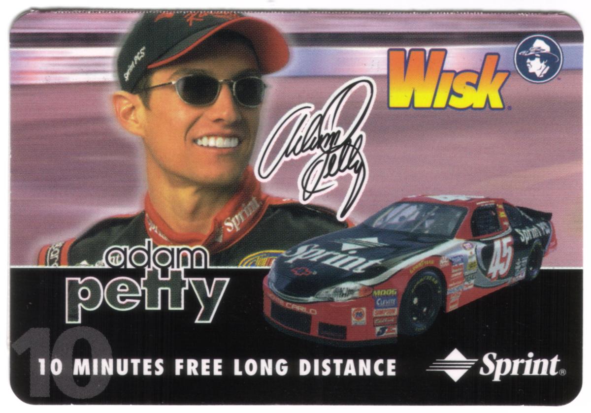 This collectible phone card features Adam Petty, a professional NASCAR driver, prominently displayed on the left side of the card. He is shown wearing sunglasses, a black and red racing suit with sponsor logos, and a black cap with red trim. The right side of the card showcases his NASCAR Sprint car, number 45, prominently decorated with the Sprint logo on the hood and the Wisk logo on the rear side. The car is painted primarily in black with red and white accents.