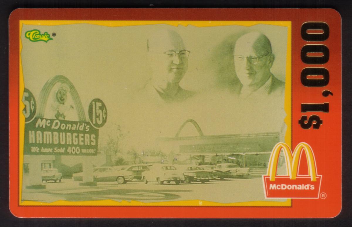 The second card features a sepia-toned image of two men above an early McDonald’s restaurant with classic cars parked outside. A large sign in the foreground advertises hamburgers for 15 cents and the fact that over 400 million had been sold. The McDonald's logo appears in the bottom right corner on the red border, alongside the $1,000 denomination written vertically on the right edge.