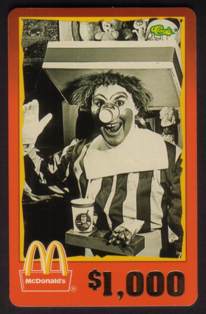 The third card displays a person dressed as Ronald McDonald, striking a friendly pose with one hand raised. The clown holds a tray containing a drink and a box of food. The red border again shows the McDonald's logo on the bottom left and the $1,000 value at the bottom.