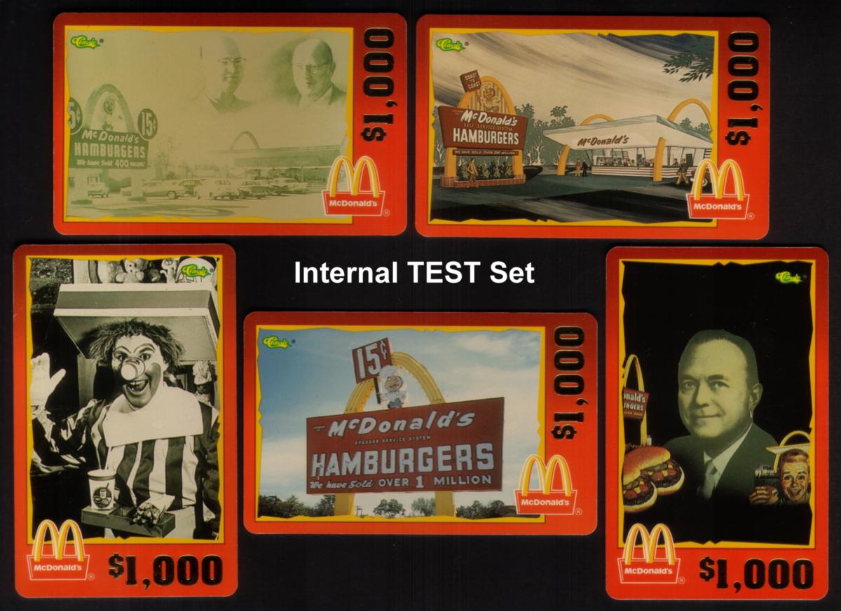 Together, these five cards commemorate McDonald’s history and advertising through imagery ranging from historical figures and vintage signage to mascot portrayals, all presented on a consistent red border with the McDonald's logo and $1,000 denomination, forming a complete matched internal test set from 1996.