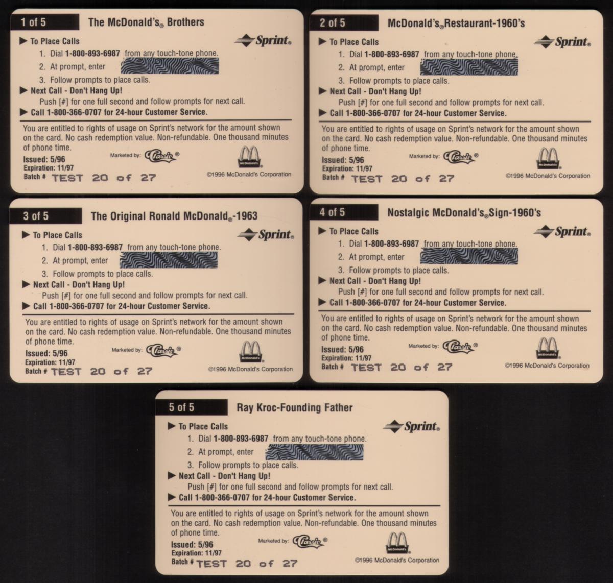 This is a set of five collectible McDonald's phone cards issued in 1996, each valued at $1,000. Each card features imagery connected to the history and branding of McDonald's, reflecting the iconic golden arches and classic advertising elements from the fast food chain.