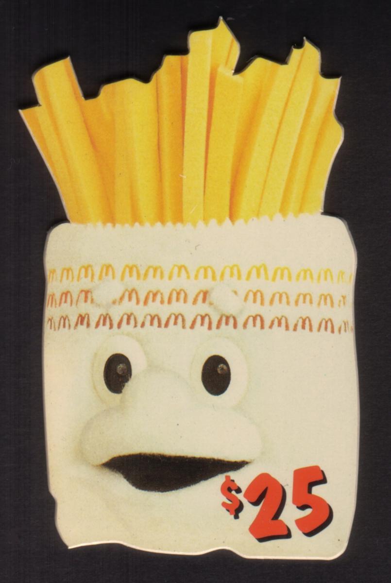 The lower half of the fry carton shows a three-dimensional cartoonish face with round eyes and a wide open mouth giving it character and charm. A vibrant red "$25" denomination is prominently displayed on the bottom right corner of the front face, indicating the card’s value. The overall design is cheerful and closely associated with McDonald's branding and food offerings.