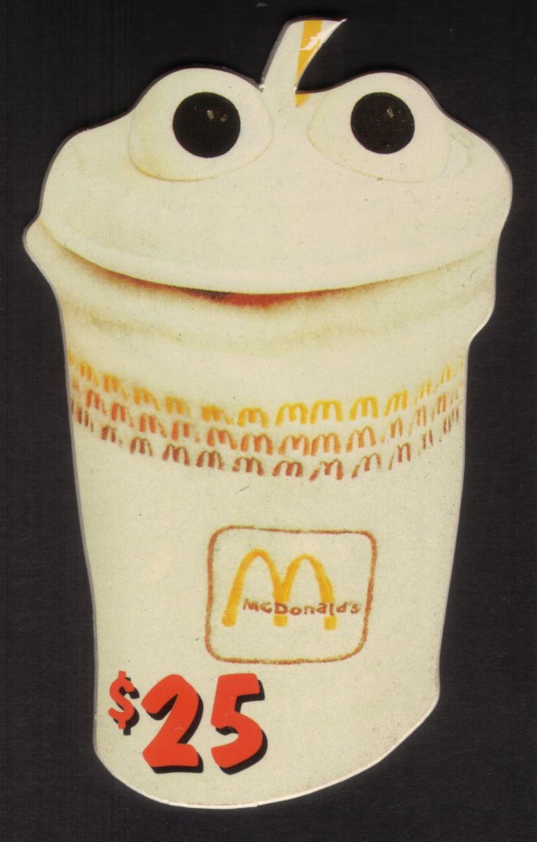 This collectible card features a die-cut design shaped like a McDonald's milk shake cup. The card showcases a smiling, anthropomorphic milk shake with large, round eyes positioned on the cup's lid, giving it a playful and friendly character. The top of the cup lid is white with a small yellow McDonald's Golden Arches logo prominently displayed in the center.