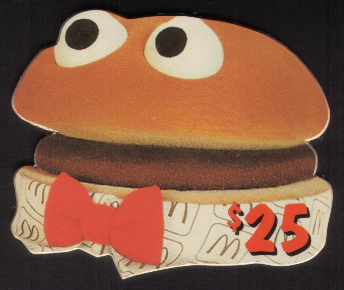 The second card is shaped like a classic hamburger with a bun, patty, and the bottom wrapper visible. The hamburger character has large, round eyes on the bun and wears a bright red bow tie on the wrapper. The "$25" value is prominently displayed in the bottom right area in the same bold red font with a black outline.