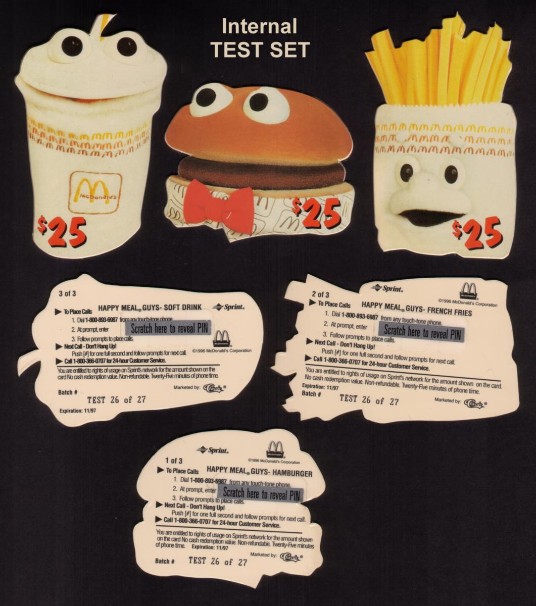 These cards were produced in 1996 and are part of a McDonald's die-cut set that highlights the Hamburglar performance scoreboard series. The set captures the brand’s famous food items—french fries, hamburger, and soft drink—in a playful, anthropomorphic style using bright colors and distinctive McDonald's branding elements.