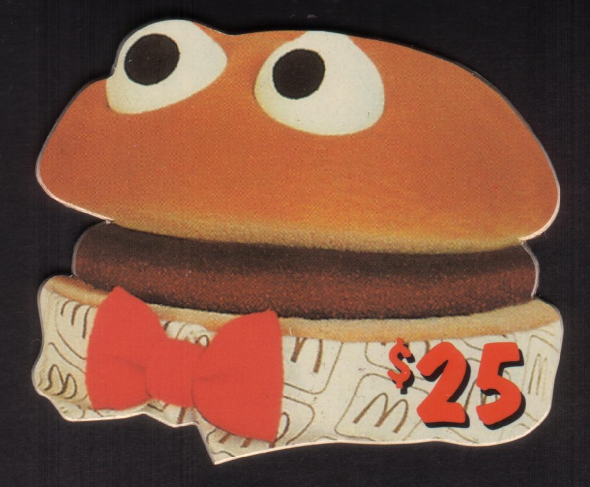The second card features a hamburger character with a brown burger patty and fully rounded bun, adorned with a red bow tie. The bun serves as the face, with two large eyes positioned near the top. Below the hamburger and to the right side is the denomination "$25" in bold red print.
