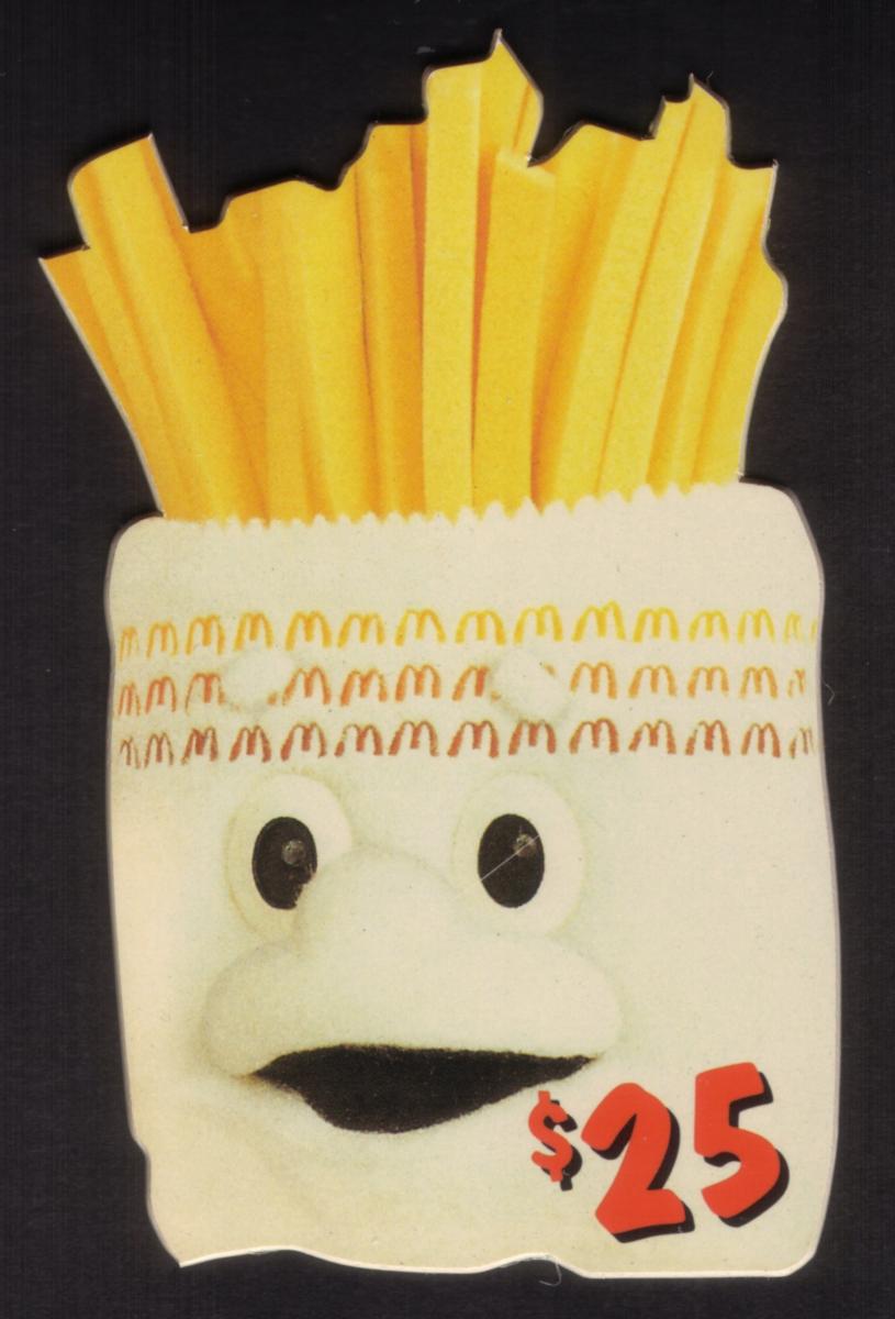 The third card illustrates french fries in a white container with the same orange and red McDonald’s "M" logo pattern near the top, similar to the soft drink cup. The fries protrude from the top of the container like hair. The face on the fry carton has wide eyes set above a smiling mouth. The "$25" value is displayed in bold red print at the bottom right corner of the fries pack.