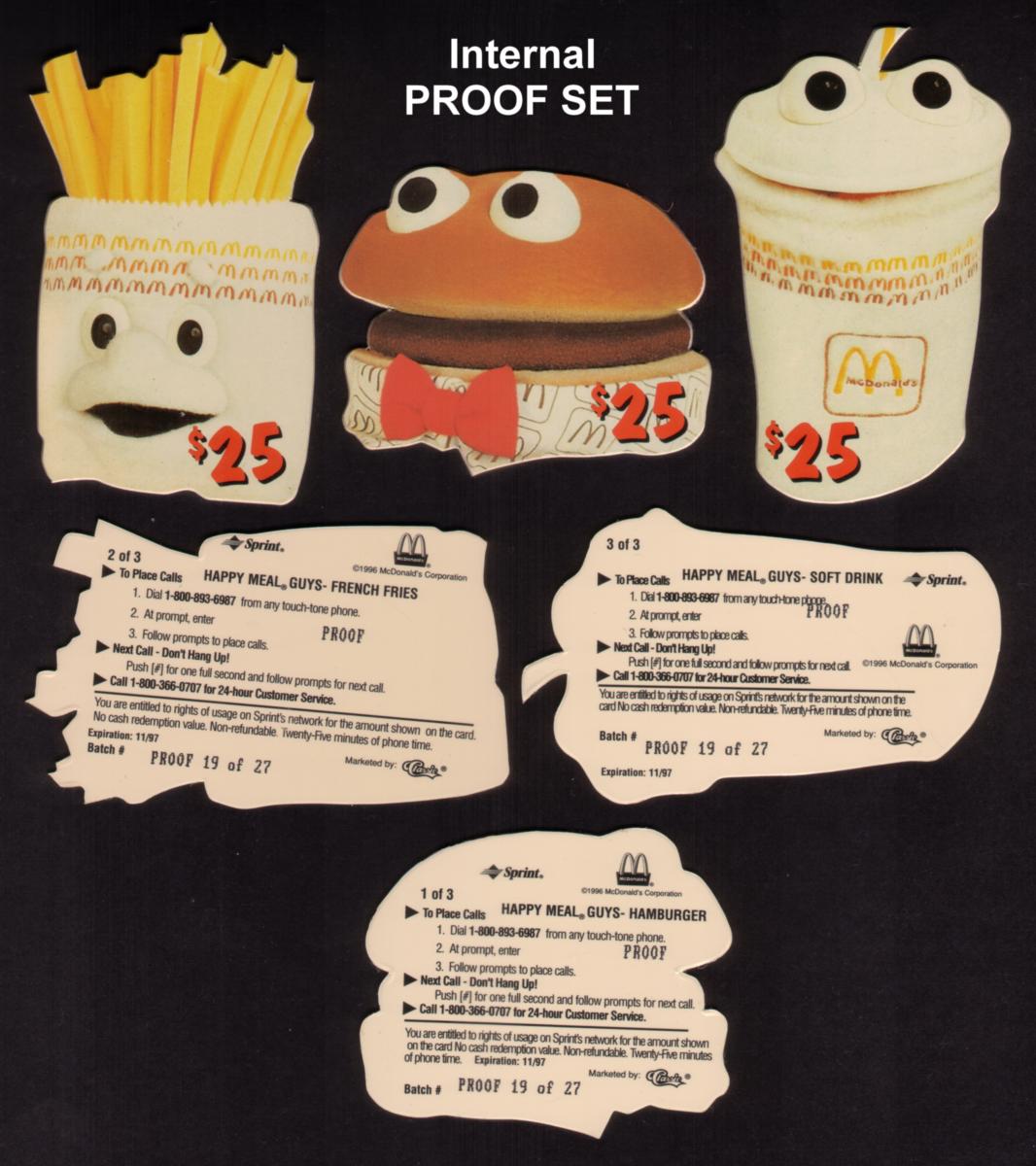 This set includes three McDonald’s collectible die-cut cards from 1996, each valued at $25. Each card features an iconic McDonald's menu item personified with cartoon-like expressive eyes and facial features.