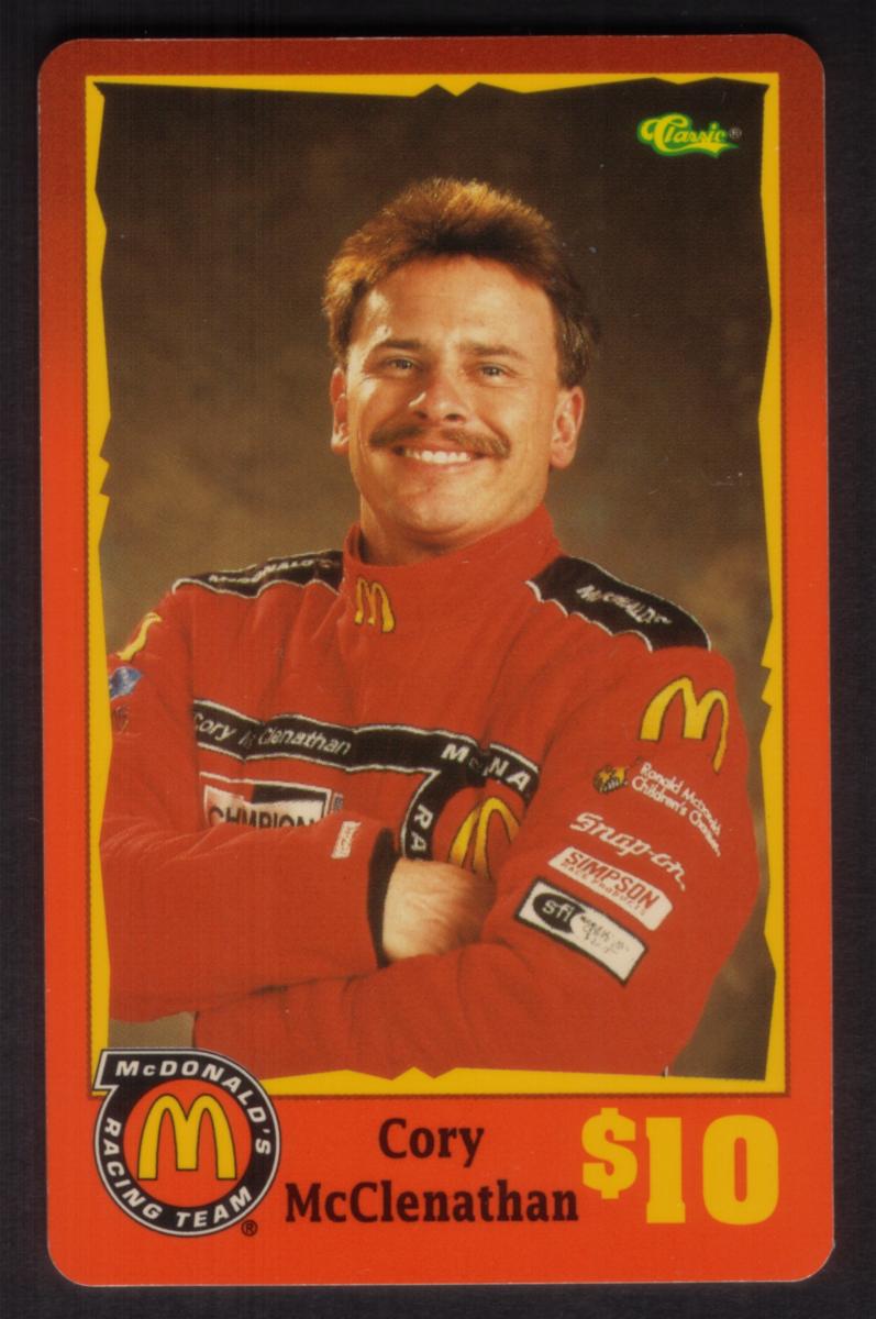 The card has an orange border with a gold inner design framing the photo. In the lower section of the card, the McDonald's Racing Team logo is placed on the left, and Cory McClenathan’s name is printed clearly in black text. To the right, the card’s value of $10 is boldly marked in yellow. In the upper right corner, the "Classic" logo appears in green text.
