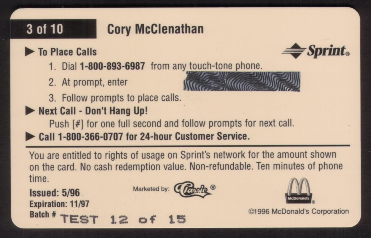 This card is from the 1996 McDonald's & Sports series and is associated with auto racing. It is limited as part of an internal test, numbered #3 out of 10, and also identified as TEST/15. The card represents a collectible tied to Cory McClenathan and the McDonald's Racing Team.