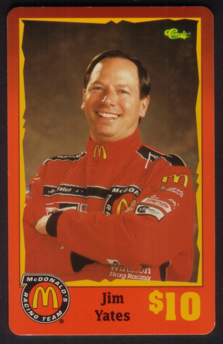This collectible card features a photographic portrait of Jim Yates, a race car driver for the McDonald's Racing Team. Jim Yates is shown smiling, wearing a red racing suit prominently branded with McDonald's logos, including the iconic yellow "M" on the left chest and shoulders. Additional sponsor logos visible on the suit include "Wil-son Drug Racing" and various other smaller patches on the sleeves and chest. His arms are crossed in front of him, presenting a confident and approachable demeanor.
