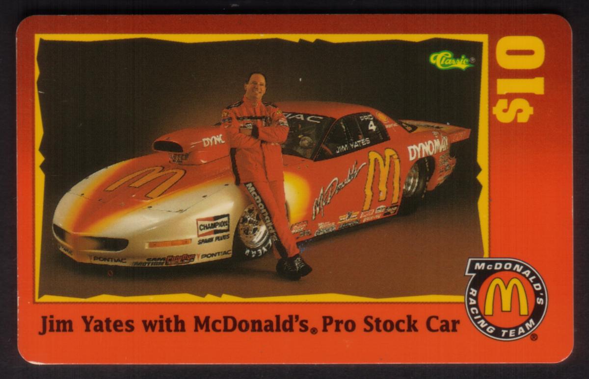 This collectible card features Jim Yates standing confidently beside his McDonald’s Pro Stock Car. The car is predominantly bright red with the large iconic yellow McDonald’s "M" logo clearly displayed on the hood and sides. The vehicle also displays various sponsor logos including Champion and DynoMax, emphasizing its racing credentials. Jim Yates is dressed in a matching red racing suit, posing with his arms crossed, exuding a professional and composed demeanor.