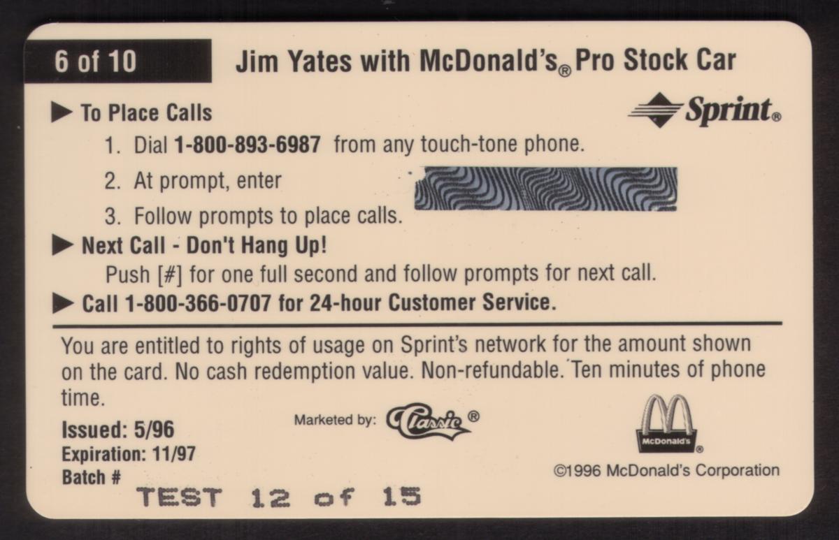 This card is part of the 1996 McDonald’s and Sports series and is marked as number 12 of 15 in the set. It is identified as a test card with some ink missing, which has resulted in a discounted price from $10. The detailed and vivid imagery highlights Jim Yates and his racing team association with McDonald's, making it a notable collectible for fans of auto racing and McDonald's memorabilia.