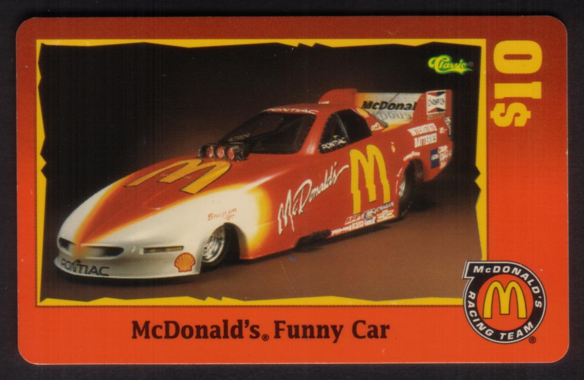 This McDonald’s Funny Car collectible card is dated from 1996 and issued as a $10 card with a limited edition marking of #10 out of 10 in the series. It is part of McDonald’s and Sports auto racing team memorabilia and showcases a detailed photograph of the racing funny car emphasizing sponsorship and team identity typically associated with competitive drag racing events.
