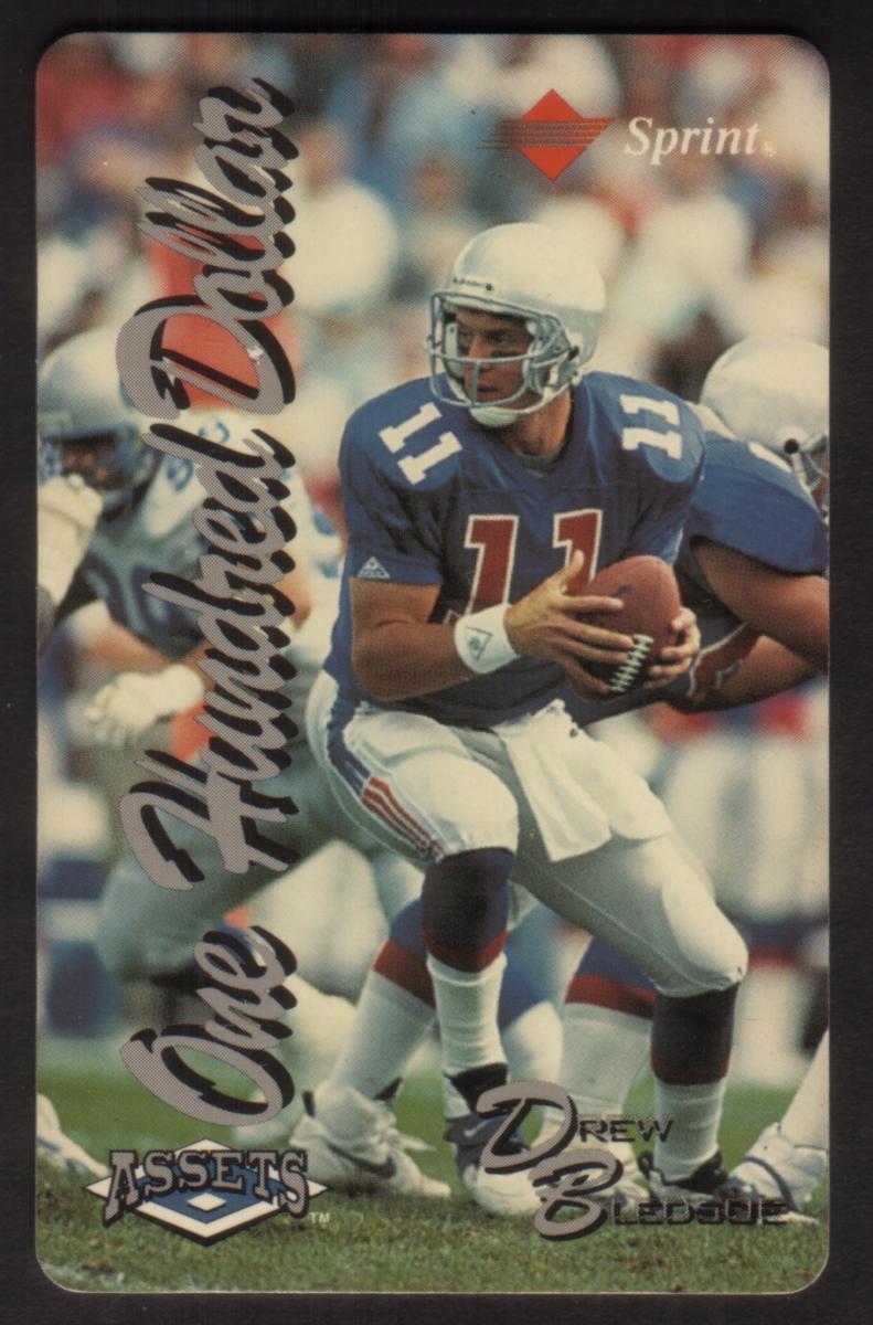 The Sprint logo appears in the top right corner of the card, indicating the service provider associated with this phone card. This collectible is from the Assets Series #1 dated 1994, specifically linked to NFL football and Drew Bledsoe, with a stored value of one hundred dollars.