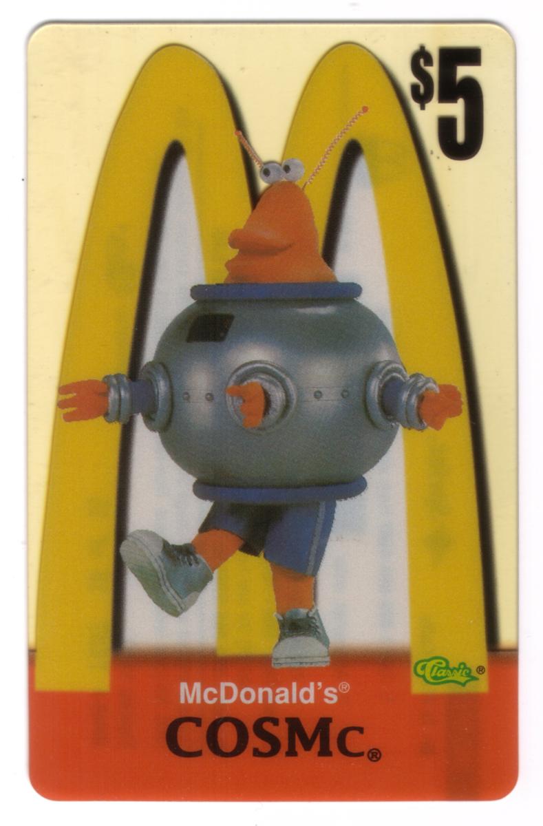 The background displays the iconic large yellow McDonald's Golden Arches logo, which spans the height of the card. The value "$5" is printed at the top right corner in black text. Below COSMc and the Golden Arches, the text reads "McDonald's® COSMc®" in black font against an orange band that runs horizontally across the bottom.