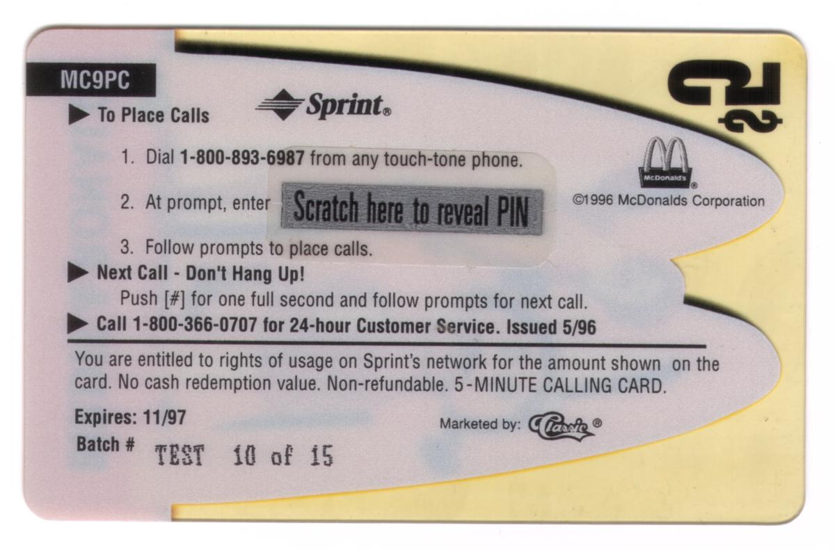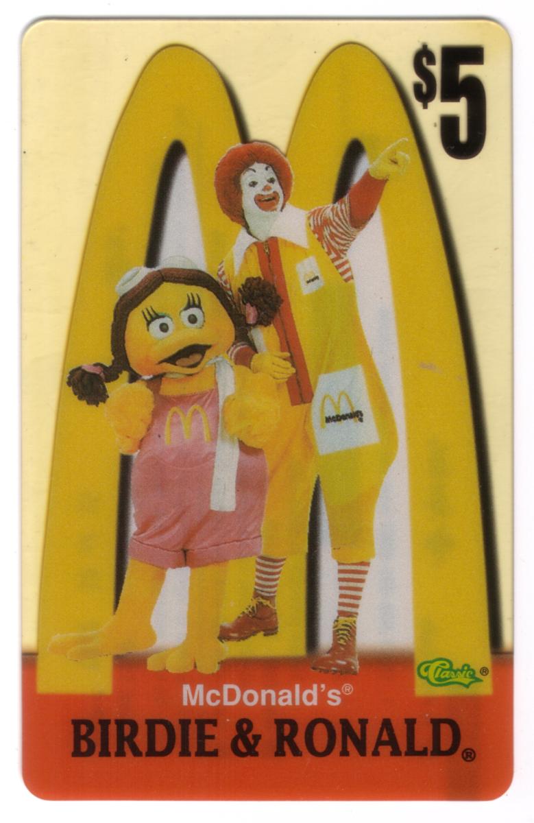 This 1996 vintage phone card is marked with #MC9PC and is part of an internal test series with a total of 15 cards. It celebrates classic McDonald's branding and characters, making it a valuable collectible for fans of fast food memorabilia and McDonald's history.