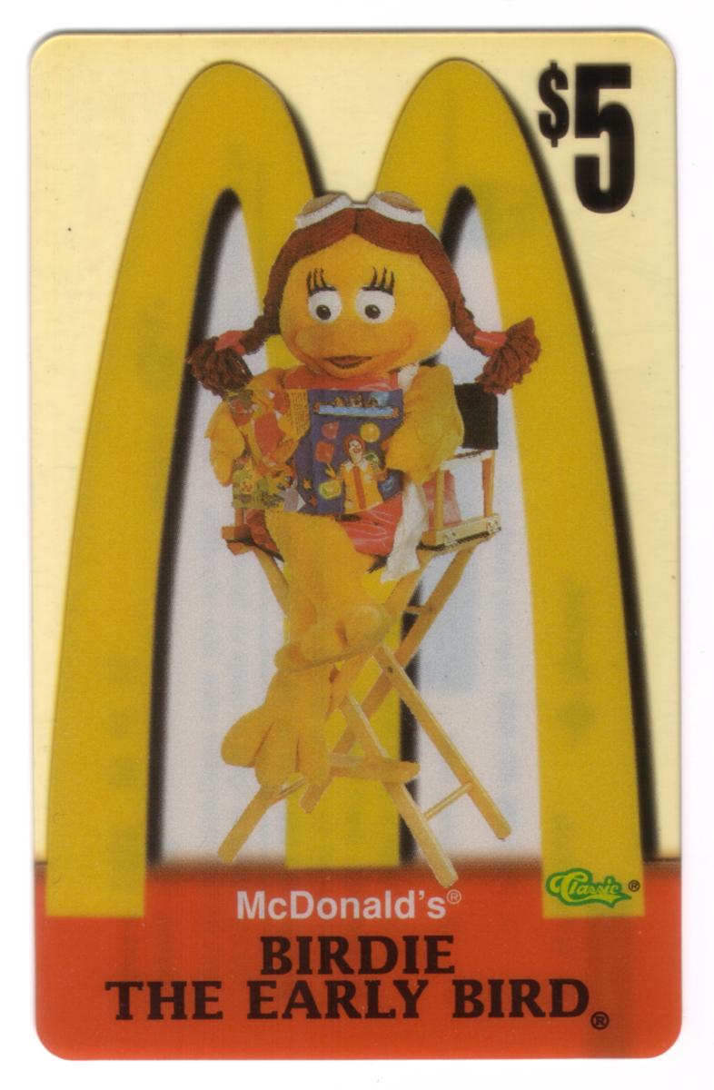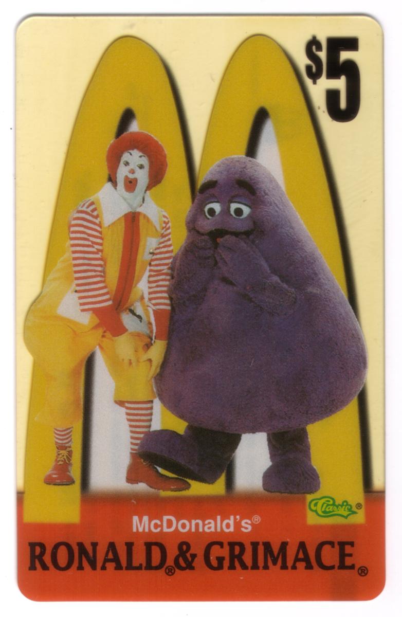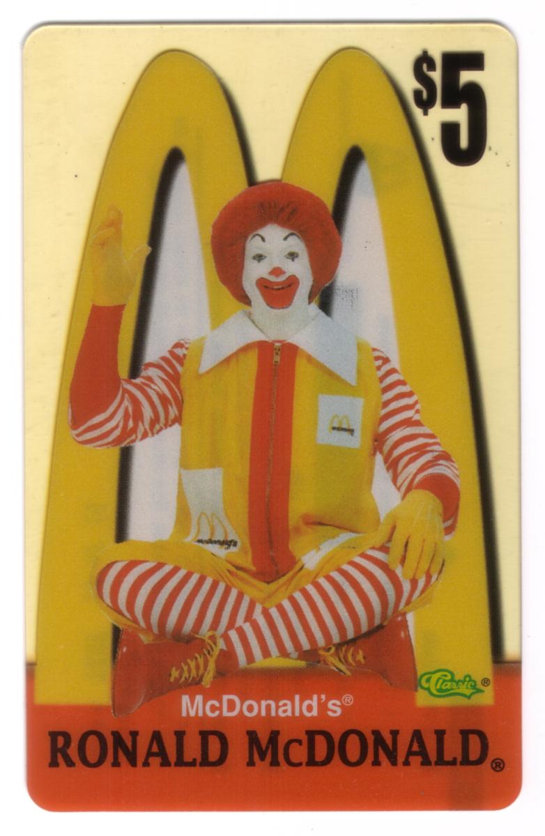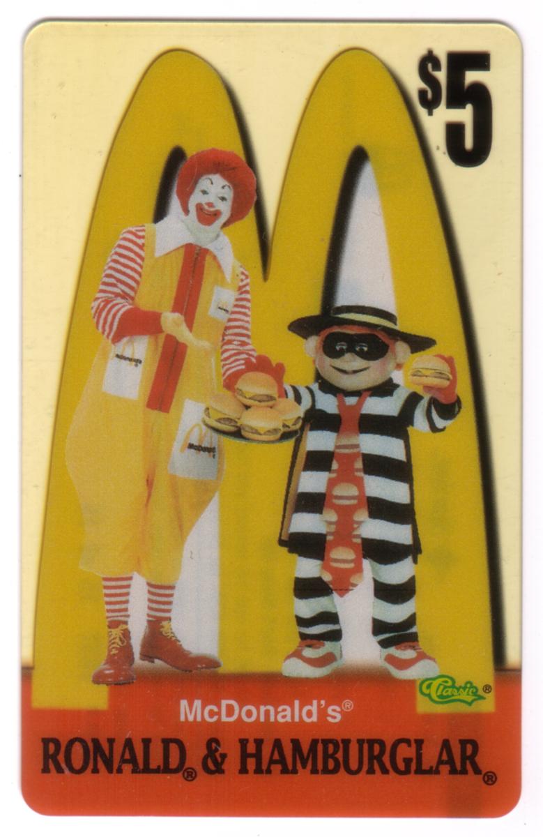 Each card has a cream-colored upper section where the denomination "$5" is displayed in black in the top-right corner, and below that is a red band at the bottom with the character's name and McDonald’s branding. The Coca-Cola logo appears on the lower right corner of each card in green and yellow. This set forms a colorful and nostalgic collection of McDonald’s promotional imagery featuring some of the most beloved fast-food advertising characters from the mid-1990s.
