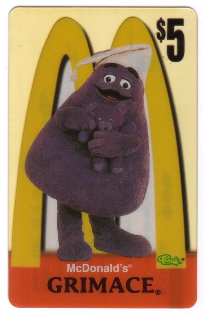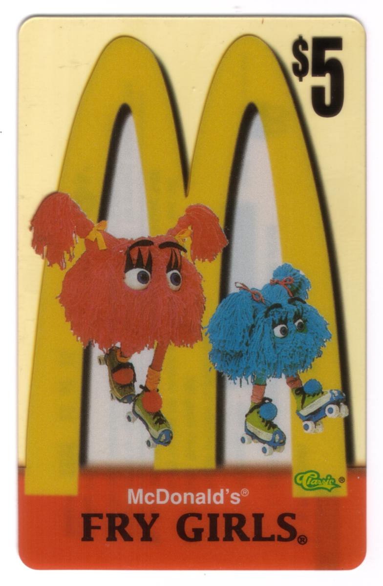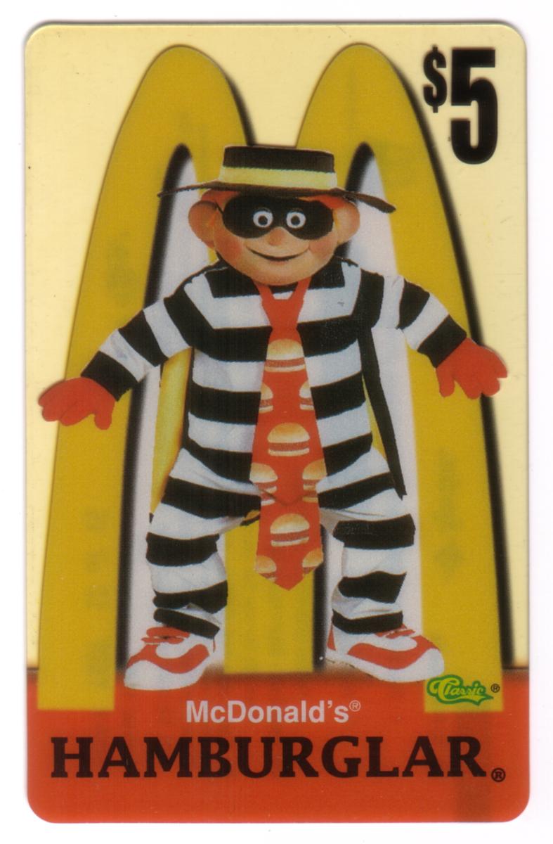 Each card has a cream-colored upper section where the denomination "$5" is displayed in black in the top-right corner, and below that is a red band at the bottom with the character's name and McDonald’s branding. The Coca-Cola logo appears on the lower right corner of each card in green and yellow. This set forms a colorful and nostalgic collection of McDonald’s promotional imagery featuring some of the most beloved fast-food advertising characters from the mid-1990s.