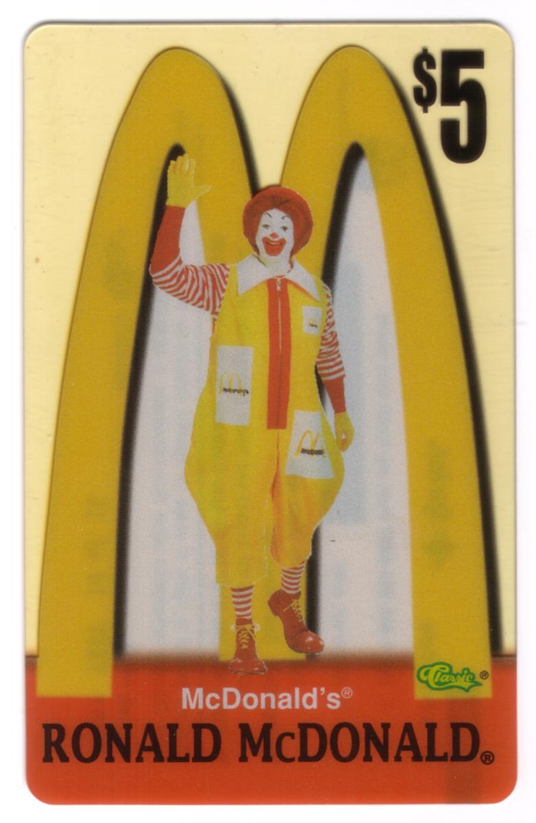 This collection features ten McDonald’s $5 collectible phone cards from 1996, each showcasing a different iconic McDonald’s character or character duo against a backdrop of the classic yellow McDonald’s Golden Arches logo. Every card has the McDonald’s name printed in white, along with the character’s name boldly displayed in black capital letters at the bottom. The cards include Ronald McDonald, CosMc, Hamburglar, Birdie the Early Bird, Grimace, Fry Girls, Ronald & Grimace, Birdie & Ronald, and Ronald & Hamburglar. Each character is presented in a full-color photograph emphasizing their distinctive costumes and poses. Ronald McDonald appears twice individually—once standing and waving, and once sitting cross-legged while waving.