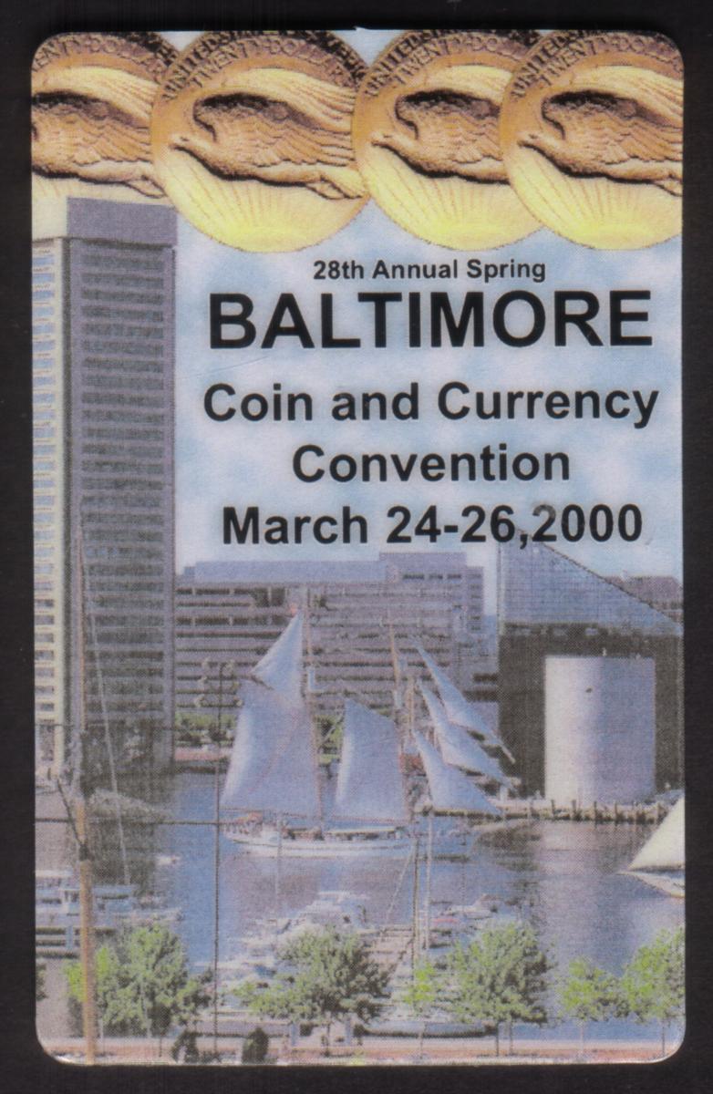 This collectible card commemorates the 28th Annual Spring Baltimore Coin and Currency Convention held from March 24 to 26, 2000. The card features a photographic image of Baltimore’s Inner Harbor waterfront, showing sailboats on the water with modern buildings lining the background. Prominently visible are the National Aquarium and other recognizable Baltimore high-rise structures.