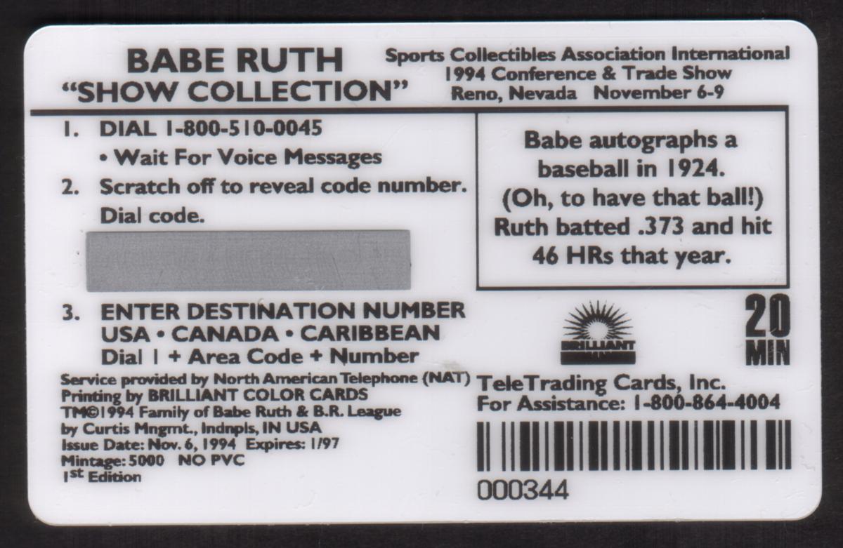 The card's details connect it to the North American Telephone series by TeleTrading Cards Inc., Reno Nevada, highlighting Babe Ruth among sports celebrities and baseball legends. It showcases one of the most iconic figures in baseball history and celebrates his legacy in collectible form.