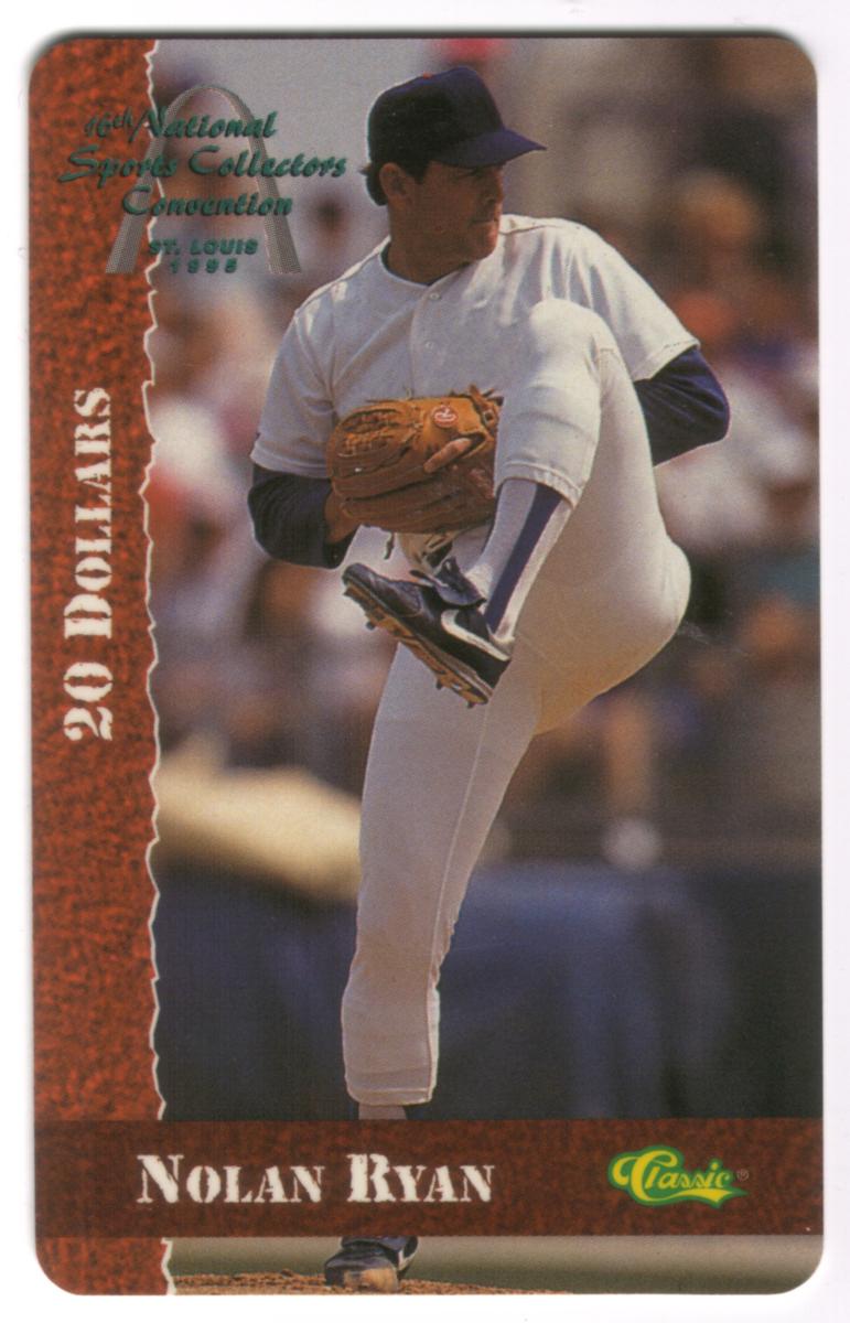 The card includes "20 DOLLARS" printed vertically along the left side on a textured brown strip. Above the denomination, the text "16th National Sports Collectors Convention St. Louis 1995" is displayed, indicating the event and year associated with the card. At the bottom, "NOLAN RYAN" is printed in white capital letters against a matching brown textured strip, with the Classic logo positioned just to the right.
