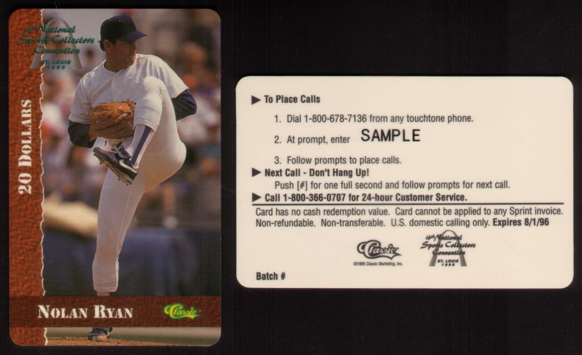 This item is a specimen chip card issued by The Score Board Inc., commemorating Nolan Ryan's appearance at the 1995 National Sports Collectors Convention held in St. Louis. The card highlights key sports-related themes such as baseball, MLB, and Major League Baseball legends.