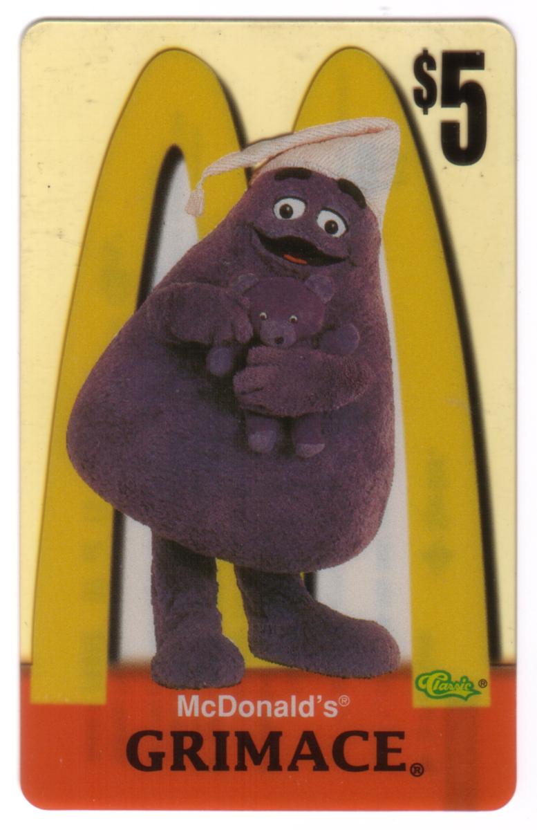 This collectible card features Grimace, the purple character from McDonald's, standing in front of the iconic Golden Arches logo. Grimace is wearing a white sleeping cap with a small pom-pom at its tip and is holding a smaller plush figure of himself. The background prominently displays the large yellow McDonald's "M" logo. The card's denomination of $5 is printed at the top right corner.