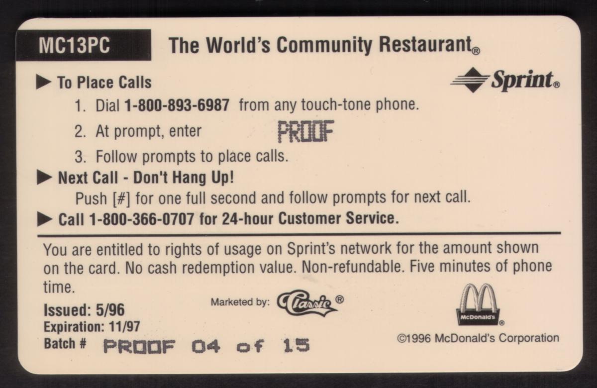 This McDonald's phone card dates from 1996 and is identified as the "World's Community Restaurant (#MC13PC)" collectible. It connects the company’s branding with the concept of worldwide community and accessibility, symbolized through the Earth globe and the iconic Golden Arches.