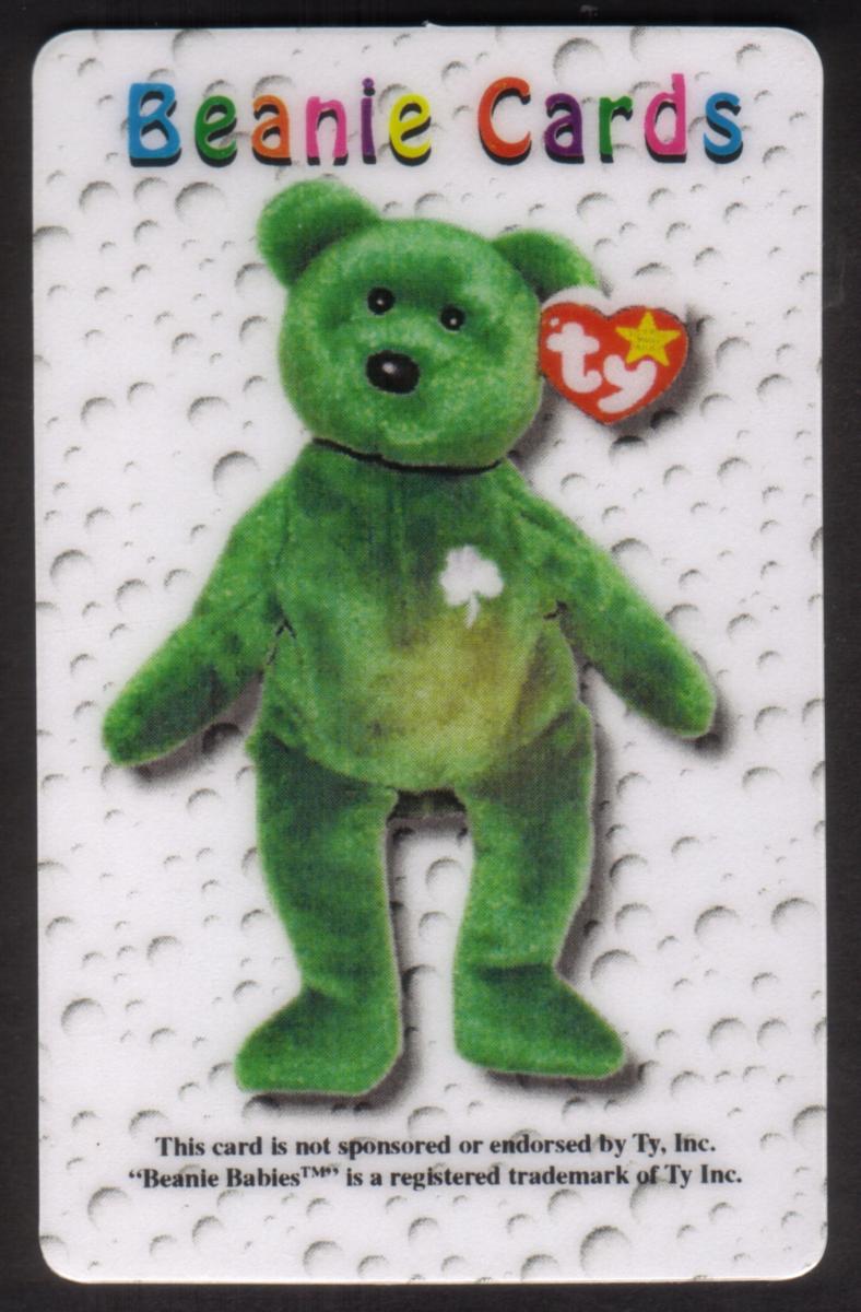 This is a collectible Beanie Card featuring Green Erin The Irish Bear, a Ty Beanie Baby. The front of the card displays a clear image of the green plush teddy bear with a white clover embroidered on its chest. Erin is shown standing upright, with a black nose and black eyes. The top of the card features the colorful text "Beanie Cards" in a multicolored, playful font.