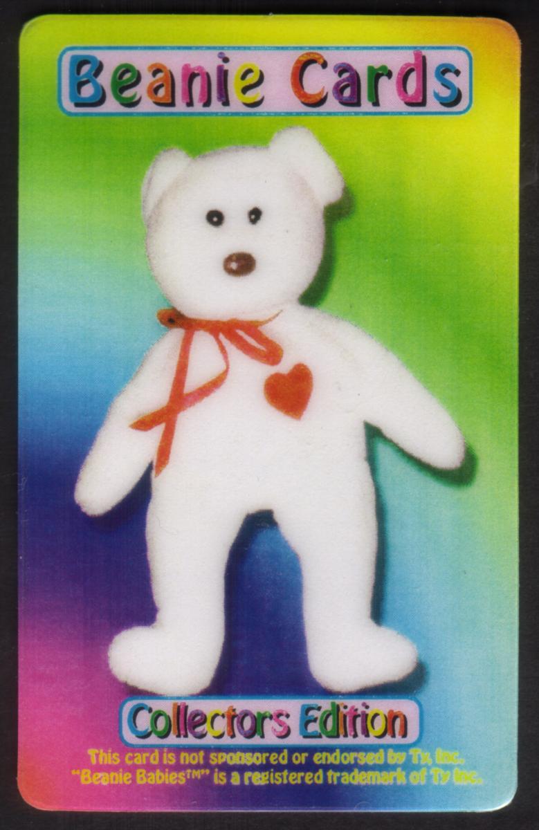 This card represents a collector’s edition from Tell-One Inc., associated with the Ty Beanie Babies line. The imagery clearly highlights Valentino The Bear, a well-known Valentine’s Day themed Beanie Baby from 1999.