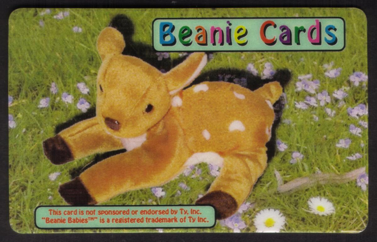 The background setting of the card consists of vibrant green grass with scattered flowers, giving it a natural outdoor appearance suited to the deer theme. The overall presentation combines bright colors with a playful design to highlight the Beanie Babies collectible.