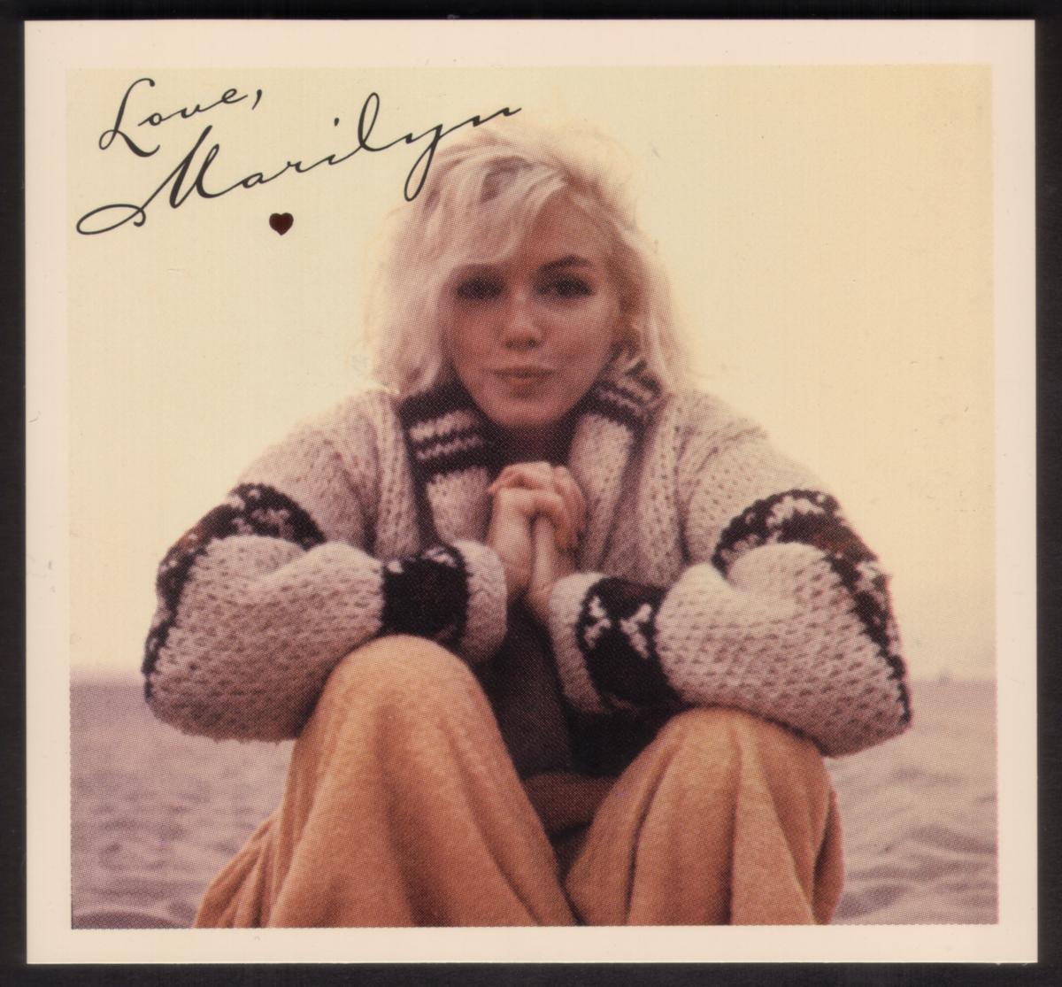 In the upper left corner of the card, there is a handwritten-style inscription in black ink that reads "Love, Marilyn" with a small heart symbol beneath the signature. The card has a white border framing the photograph, and the image measures about 3.75 inches by 3.50 inches according to the text included on the card.