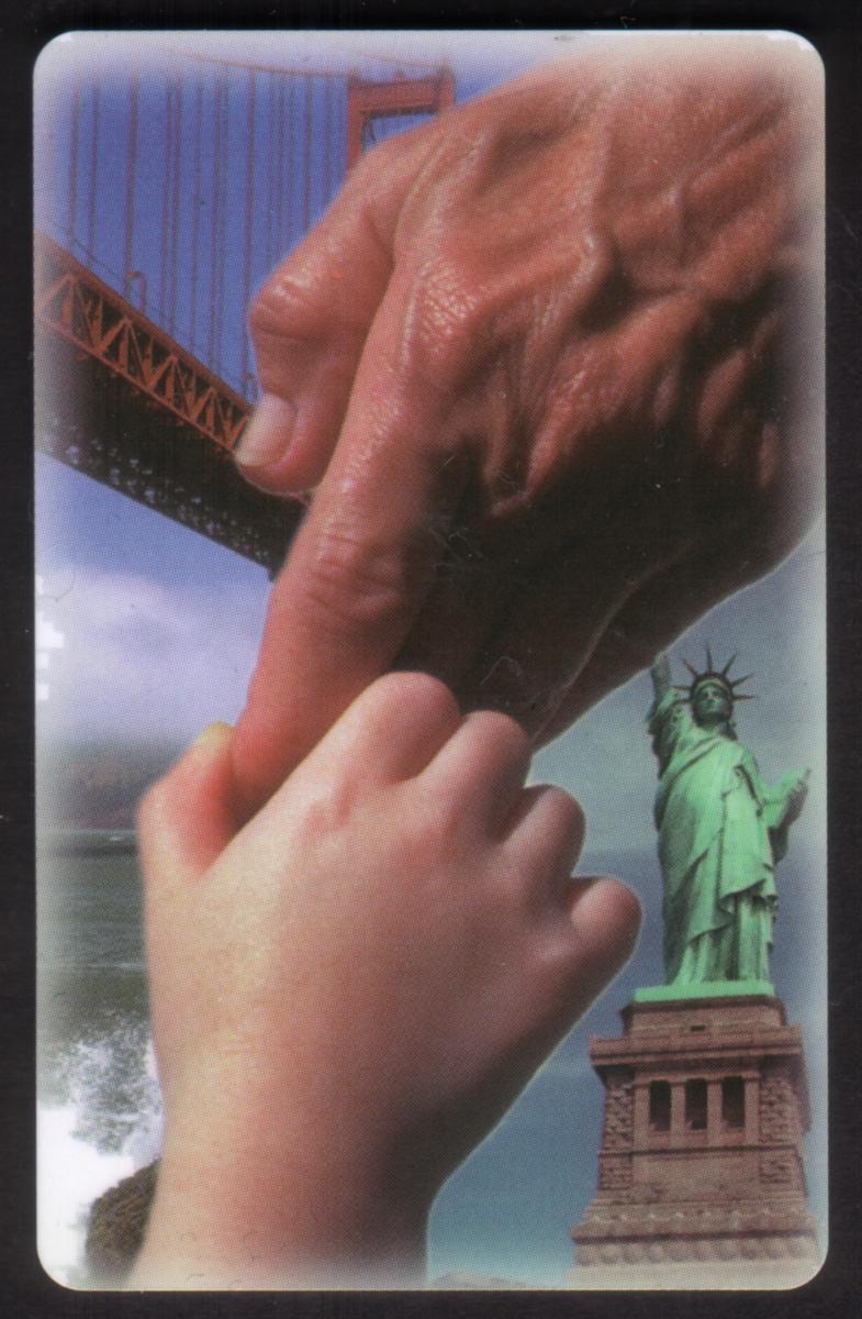 This collectible phone card features a photographic image of two notable New York City landmarks: the Statue of Liberty and the Hand in Hand sculpture. The Statue of Liberty is prominently displayed on the right side of the card, set against a clear blue sky. The Hand in Hand sculpture, located on the left side, depicts two clasped hands symbolizing unity and cooperation. Both images are presented in bright daylight, highlighting the iconic status of these landmarks.