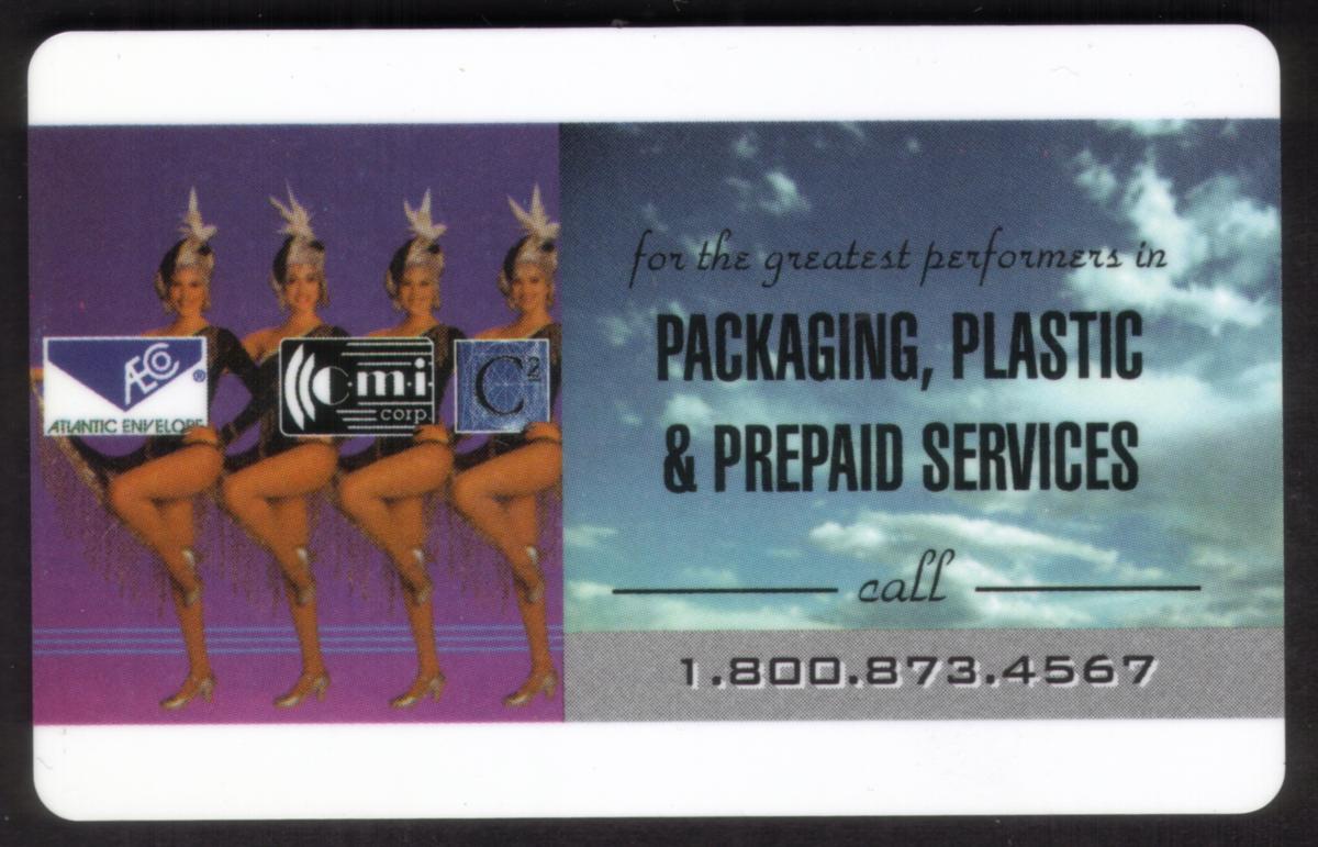 Centered toward the left side of the card is an image of two Rockettes dancers performing a high-kick, wearing their classic cheerleader-style costumes in red and white, symbolizing the famous Radio City Rockettes. The dancers add a dynamic and celebratory element to the card, tying it directly to the New York City theme and the festive nature of the TeleCard World 1996 expo. Additional text includes promotional mentions of "Creative Communication," "Atlantic Envelope," and prepaid services related to the event.