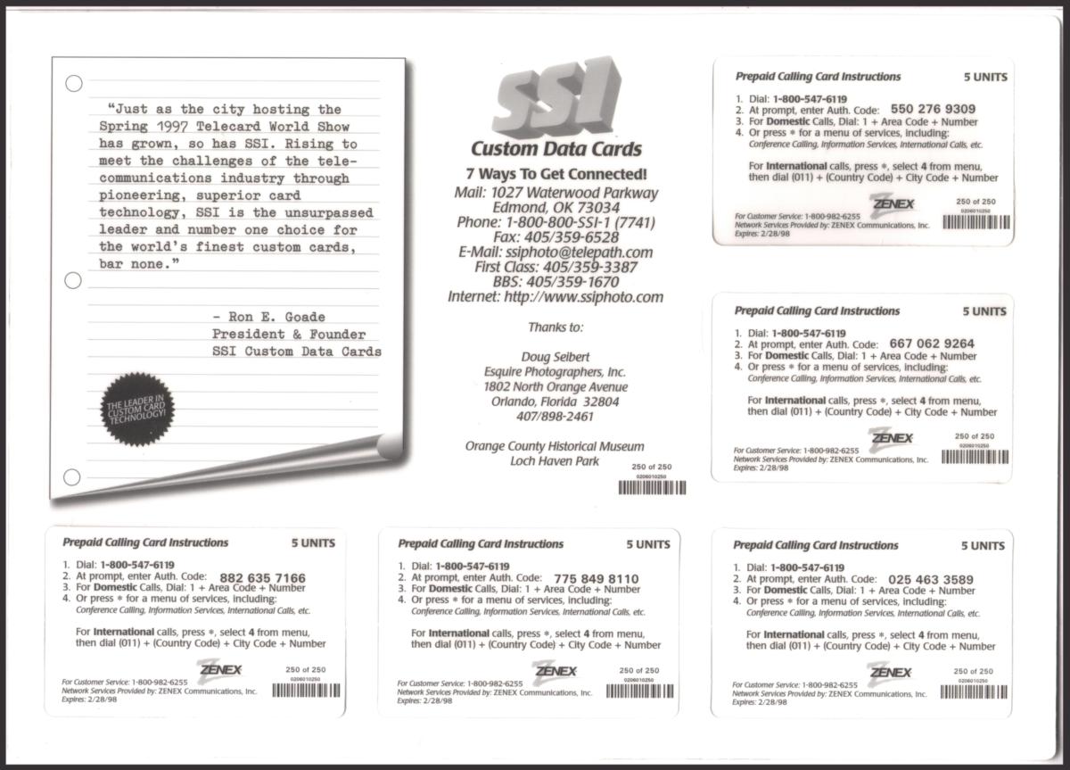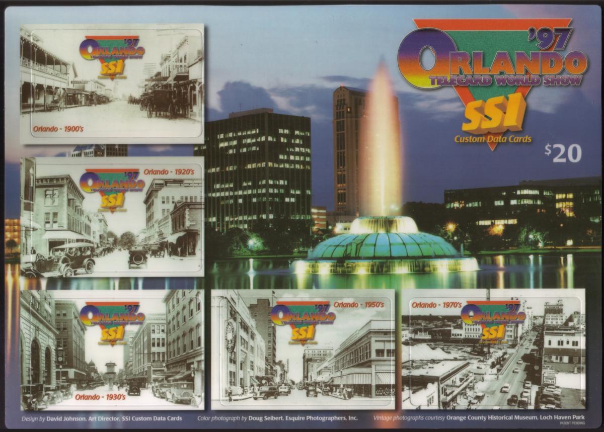 This collectible card set titled "Telecard World '97 Orlando" features a series of five custom data cards produced by SSI, highlighting old Orlando, Florida scenes. Each card presents a distinct vintage street view from various decades in Orlando’s history: 1891, 1920s, 1930s, 1950s, and 1970s. These black-and-white photographic images showcase the city’s historic architecture, streets, and vehicles characteristic of their respective periods. The cards bear the colorful logo "ORLANDO ‘97 Telecard World Show SSI Custom Data Cards" prominently at the top in each vintage image.