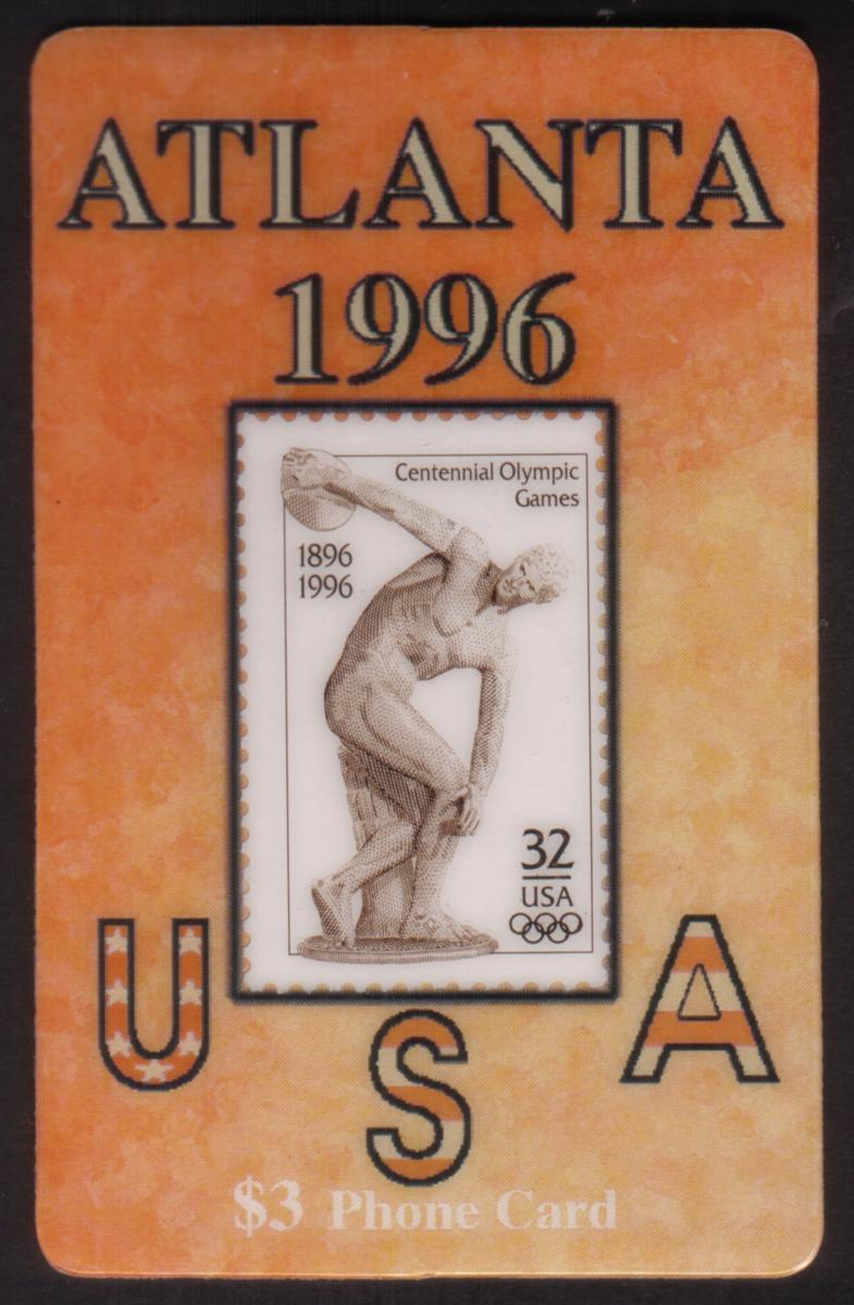 This collectible $3 phone card features a postage stamp design commemorating the Centennial Olympic Games held in Atlanta, Georgia in 1996. The card’s central image is a detailed depiction of a 32-cent USA postage stamp showing a classical statue of a male discus thrower in motion. The words "Centennial Olympic Games" appear on the stamp along with the years "1896" and "1996," marking 100 years since the first modern Olympics.