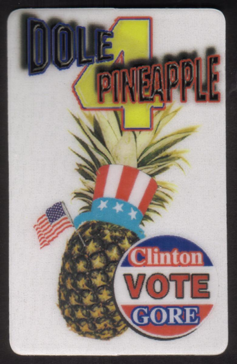 The design references the 1996 U.S. presidential election, featuring the candidates Bill Clinton and Al Gore in support of Clinton/Gore, alongside Bob Dole, who ran against them. The card creatively combines political campaign imagery with the fruit pineapple, symbolizing the slogan "Dole 4 Pineapple." The use of Americana elements, such as the American flag and the patriotic hat, reinforces the political theme of this collectible.